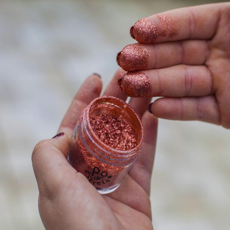 Pó de Estrela Bronze é biodegradável e tem origem mineral. Feito de mica sintetizada, é bem mais fino que a purpurina. Fixa na pele sem necessidade de algo para ‘colar’ é lavável, não tóxico.